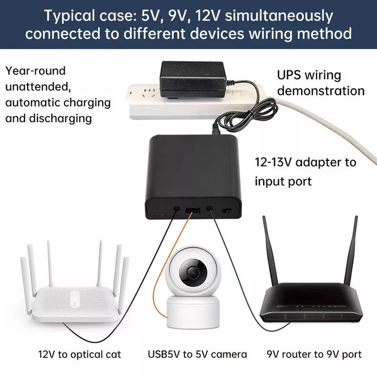 مینی یو پی اس Mini UPS DU-5912 ، وسیله ای بسیار کاربردی می باشد که با دارا بودن خروجی های مختلف می تواند در زمان قطعی برق، همزمان چندین وسیله حساس مورد نیاز از قبیل مودم ، روتر ، کارتخوان ، دوربین مدار بسته و .... را تا مدت زمان قابل قبولی روشن نگه داشته و از خسارات ناشی از قطع برق بکاهد . این مینی یو پی اس دارای 3 خروجی مستقل می باشد : 12 ولت 2 آمپر ( فیش آداپتوری استاندارد 2.1*5.5 ) ، 9 ولت 1 آمپر ( فیش آداپتوری استاندارد 2.1*5.5 ) ، 5 ولت 3-2 آمپر ( فیش USB ) که می تواند برق طیف وسیعی از دستگاه های برقی مورد نظر را تامین کند . این مینی یو پی اس، بدون باتری عرضه می شود و کاربر متناسب با مقدار نیاز باید 3 عدد باتری لیتیون یونی 18650 سرتخت با ظرفیت مدنظر ( حداکثر 3400 mAh ) را جداگانه تهیه نماید . یک عدد کابل دو سر آداپتوری در بسته بندی دستگاه موجود می باشد و در صورت نیاز به تعداد بیشتر یا نیاز به فیش تبدیل متناسب با ورودی دستگاه ها ، باید جداگانه تهیه شود .