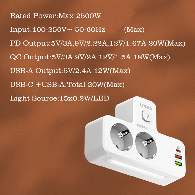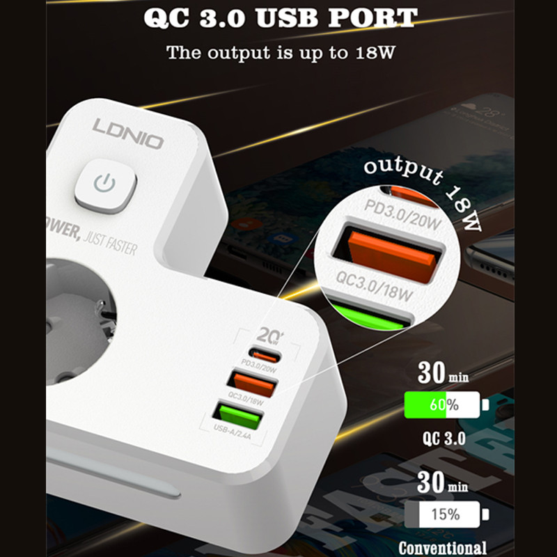 امروزه با زیاد شدن دستگاههای الکترونیکی و احتیاج به تامین انرژی، نیاز به چند راهی ها بیشتر احساس می شود. برند الدینیو از پیشتازان در عرصه تولید لوازم جانبی است و این محصولات از کیفیت بالایی برخوردار هستند. از تولیدات به روز این کمپانی می توان به چند راهی برق الدینیو مدل SE2337 اشاره کرد که محصول مناسبی برای میز کار شما محسوب می شود. این چند راهی علاوه بر 2 پریز برق، 3 خروجی USB نیز دارد که 2 خروجی USB-A و خروجی دیگر خروجی USB-C است. خروجی USB-C قابلیت PD3.0 و یکی از خروجی های USB-A قابلیت QC-3.0 را دارد تا بتوانید با سرعت بالا وسایل دیجیتال خود را شارژ کنید. توان کلی این محصول 2500 وات است. جنس بدنه چند راهی برق الدینیو مدل SE2337 از PC نسوز است و در برابر دمای بالا مقاوم است. یک کلید روی بدنه چندراهی برق الدینیو مدل SE2337 قرار گرفته است که امکان قطع و وصل کردن جریان برق را ایجاد میکند. با داشتن این محصول میتوانید به طور همزمان از 2 پریز برق و 3 خروجی USB استفاده کنید. در قسمت پایینی این محصول یک لامپ قرار داده شده که علاوه بر جذابیت، به عنوان چراغ خواب نیز کاربرد دارد. مشخصات فنی چند راهی برق الدینیو مدل SE2337 به شرح زیر است : Rated Power : 2500W Rated Voltage : 100-250V | 50-60Hz | 10A(Max) PD Output : 5V/3A | 9V/2.22A | 12V/1.67A | 20W(Max) QC3.0 Output : 5V/3A | 9V/2A | 12V/1.5A | 18W(Max) USB-A Output : 5V/2.4A | 12W(Max) Total Power : 20W Night Lamp Power : 15*0.2W/LED یکی دیگر از ویژگی های چند راهی برق الدینیو مدل SE2337 که آن را از بسیاری از محصولات مشابه در بازار متمایز میکند، قابلیت Turbo Power Engine است که بسته به دستگاهی که به این شارژر وصل میشود، بالاترین توان برای شارژ آن تامین می شود. در نظر داشته باشید با استفاده همزمان از پورت ها توان کلی بین آنها تقسیم خواهد شد.