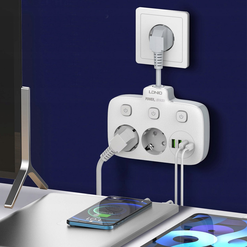 با زیاد شدن دستگاه های الکترونیکی و احتیاج به تامین انرژی آن ها نیاز به چند راهی ها را بیشتر کرده است. چندراهی LDNIO SE2435 گزینه مناسبی برای میز کار شماست. این چند راهی علاوه بر 2 خروجی برق، 3 خروجی USB و 1 خروجی Type C دارد. چندراهی الدینیو SE2435 از PC نسوز ساخته شده است. دوشاخه اتصال به برق آن از نوع EU است که با دوشاخه های ایران سازگارند و نیاز به تبدیل ندارید. سیم اتصال آن طول کمی دارد و میتوانید تا 180 درجه آن را تنظیم کنید. برای کنترل جریان برق سه کلید برای هر خروجی برق و مجموعه پورت ها روی بدنه در نظر گرفته شده است که در هنگام به خطر افتادن ایمنی نیز به صورت خودکار عمل می کند. ولتاژ ورودی این چندراهی برابر 100 تا 250 ولت و حداکثر جریان ورودی 10 آمپر می باشد. پورت Type C با پشتیبانی از قابلیت شارژ سریع PD دارای جریان/ولتاژ خروجی 5V/3A-9V/2.22A-12V/1.67A با حداکثر توان خروجی 20 وات می باشد. یکی از خروجی های USB به رنگ نارنجی با پشتیبانی از شارژ سریع QC3.0 دارای جریان/ولتاژ خروجی 5V/3A-9V/2A-12V/1.5A با حداکثر توان خروجی 18 وات می باشد. پورت های خروجی USB به رنگ سبز هر کدام با پشتیبانی از شارژ Auto ID دارای جریان/ولتاژ خروجی 5V/2.4A و حداکثر توان 12 وات می باشد. توان خروجی کل چندراهی برق الدینیو SE2435 برای پورت های USB و Type C برابر 20 وات و برای خروجی های برق 2500 وات است. می توانید همزمان از خروجی های این چند راهی استفاده کنید و 6 دستگاه را شارژ کنید. فقط در نظر داشته باشید در این صورت مانند اکثر چندراهی ها توان خروجی بین آن ها تقسیم می شود. الدینیو برای حفاظت از کودکان درپوش روی حفره سوکت های برق قرار داده است. همچنین در صورت تشخیص اضافه بار در مدار و یا رطوبت جریان را قطع می کند تا آسیبی به دستگاه شما وارد نشود. عمق حفره های سوکت برق به اندازه کافی است تا دوشاخه ای که به آن متصل می کنید بیرون نماند. همانطور که گفته شد جنس بدنه از PC نسوز است و تا 850 درجه سانتی گراد مقاومت دارد. سیمی هم که برای اتصال چند راهی به برق در نظر گرفته شده دارای ضخامت مناسبی است.