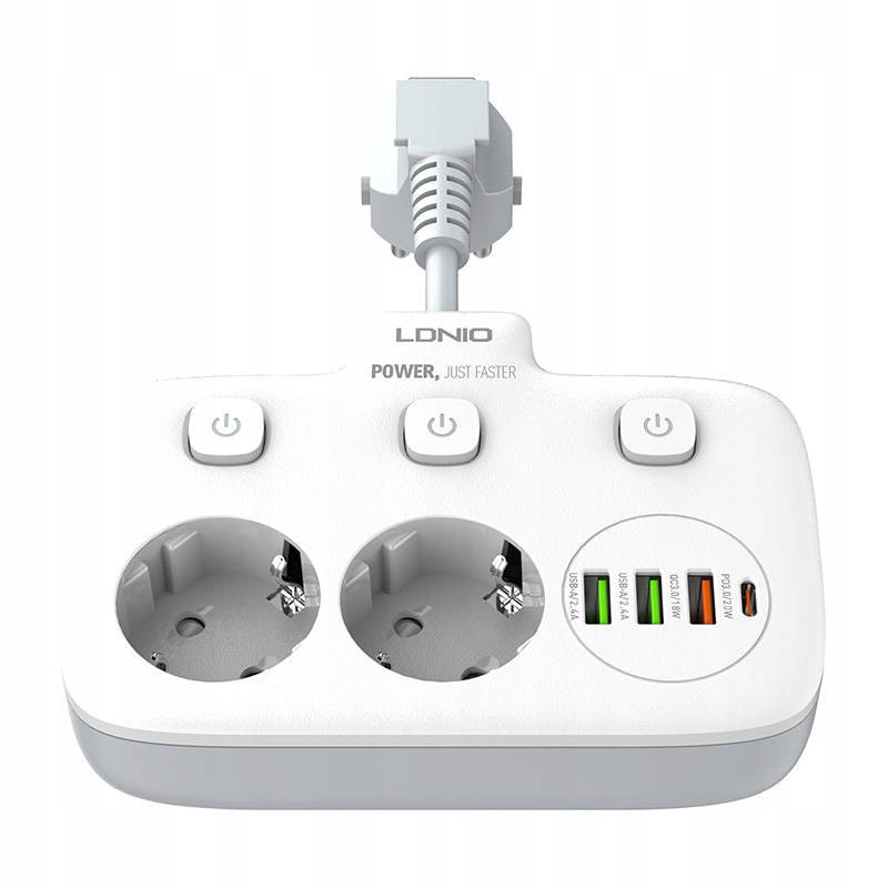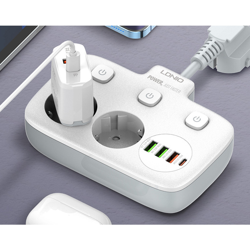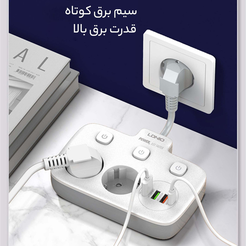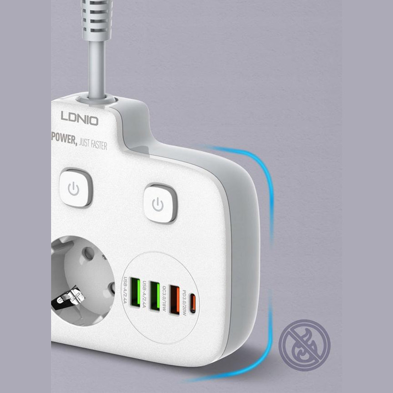 با زیاد شدن دستگاه های الکترونیکی و احتیاج به تامین انرژی آن ها نیاز به چند راهی ها را بیشتر کرده است. چندراهی LDNIO SE2435 گزینه مناسبی برای میز کار شماست. این چند راهی علاوه بر 2 خروجی برق، 3 خروجی USB و 1 خروجی Type C دارد. چندراهی الدینیو SE2435 از PC نسوز ساخته شده است. دوشاخه اتصال به برق آن از نوع EU است که با دوشاخه های ایران سازگارند و نیاز به تبدیل ندارید. سیم اتصال آن طول کمی دارد و میتوانید تا 180 درجه آن را تنظیم کنید. برای کنترل جریان برق سه کلید برای هر خروجی برق و مجموعه پورت ها روی بدنه در نظر گرفته شده است که در هنگام به خطر افتادن ایمنی نیز به صورت خودکار عمل می کند. ولتاژ ورودی این چندراهی برابر 100 تا 250 ولت و حداکثر جریان ورودی 10 آمپر می باشد. پورت Type C با پشتیبانی از قابلیت شارژ سریع PD دارای جریان/ولتاژ خروجی 5V/3A-9V/2.22A-12V/1.67A با حداکثر توان خروجی 20 وات می باشد. یکی از خروجی های USB به رنگ نارنجی با پشتیبانی از شارژ سریع QC3.0 دارای جریان/ولتاژ خروجی 5V/3A-9V/2A-12V/1.5A با حداکثر توان خروجی 18 وات می باشد. پورت های خروجی USB به رنگ سبز هر کدام با پشتیبانی از شارژ Auto ID دارای جریان/ولتاژ خروجی 5V/2.4A و حداکثر توان 12 وات می باشد. توان خروجی کل چندراهی برق الدینیو SE2435 برای پورت های USB و Type C برابر 20 وات و برای خروجی های برق 2500 وات است. می توانید همزمان از خروجی های این چند راهی استفاده کنید و 6 دستگاه را شارژ کنید. فقط در نظر داشته باشید در این صورت مانند اکثر چندراهی ها توان خروجی بین آن ها تقسیم می شود. الدینیو برای حفاظت از کودکان درپوش روی حفره سوکت های برق قرار داده است. همچنین در صورت تشخیص اضافه بار در مدار و یا رطوبت جریان را قطع می کند تا آسیبی به دستگاه شما وارد نشود. عمق حفره های سوکت برق به اندازه کافی است تا دوشاخه ای که به آن متصل می کنید بیرون نماند. همانطور که گفته شد جنس بدنه از PC نسوز است و تا 850 درجه سانتی گراد مقاومت دارد. سیمی هم که برای اتصال چند راهی به برق در نظر گرفته شده دارای ضخامت مناسبی است.