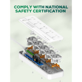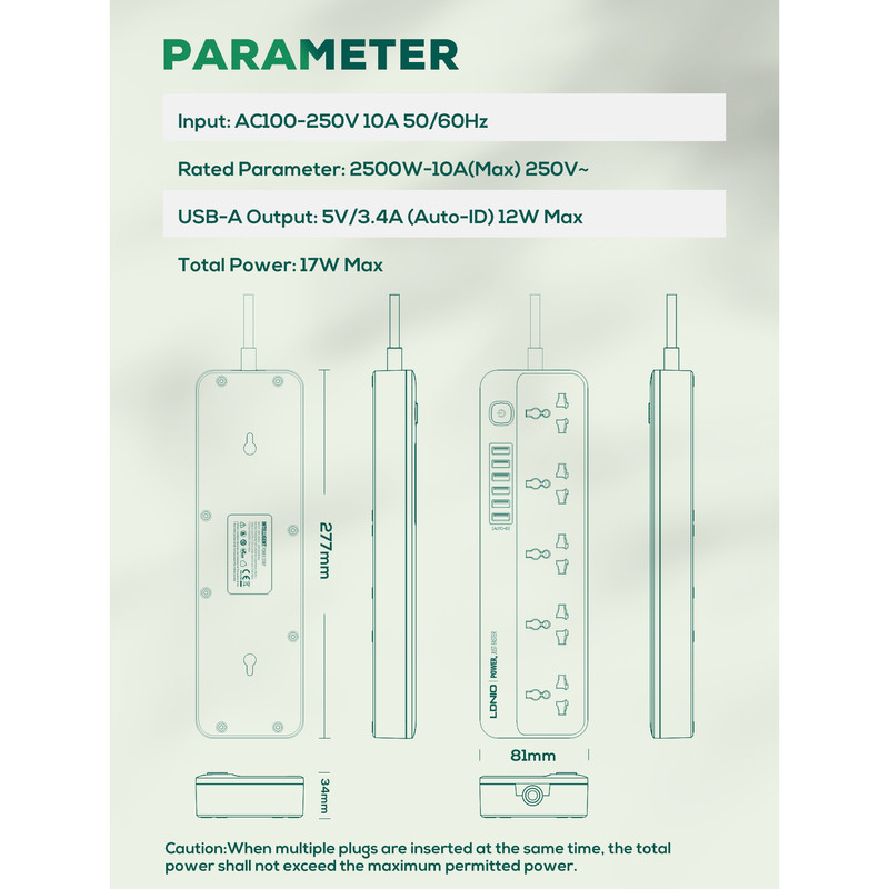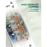 چند راهی برق و شارژر الدینیو مدل SC5614 یکی از وسایلی است که علاوهبر اینکه تعدادی کافی از پریز را در اختیار شما قرار میدهد، قابلیتهای دیگری را نیز در اختیار شما میگذارد، همچنین به دلیل رعایت استانداردهای امنیتی، استفاده از آن به شما اطمینان خاطر میدهد. در ابتدا باید اشاره کرد که مواد رسانای به کار رفته در چند راهی برق الدینیو بسیار با کیفیت بوده و از جنس مس هستند. به همین علت جریان برق به خوبی درون این چندراهی عبور میکند و اتلاف انرژی نیز به حداقل خود میرسد. این چند راهی شامل 5 پریز برق، 6 پورت USB است. توان کلی این چند راهی 2500 وات است. همچنین جنس بدنه تا دمای 850 درجه سلسیوس در برابر دما مقاومت دارد. همچنین یک کلید روی بدنه چندراهی قرار گرفته است که امکان قطع و وصل کردن جریان برق را ایجاد میکند. البته در کنار آن باید به این مورد نیز اشاره کرد که پریزها دارای محافظ کودک نیز هستند. ولتاژ ورودی این دستگاه برابر با 100V~250V است و حداکثر شدت جریان آن هم 10 آمپر است. تعداد پورتهای USB قرار داده شده روی این پریز برابر با 6 عدد است. هر 6 پورت دارای فناوری Auto ID هستند و ولتاژ و شدت جریان خروجی آنها برابر با 5V~2.4A است که حداکثر توان خروجی آنها نیز برابر با 17 وات میشود. فناوری Auto ID نیز به این شرح است که ولتاژ و شدت جریان خروجی با توجه به وضعیت دستگاه به آن وارد میشود تا از آسیب دیدن آن جلوگیری شود.