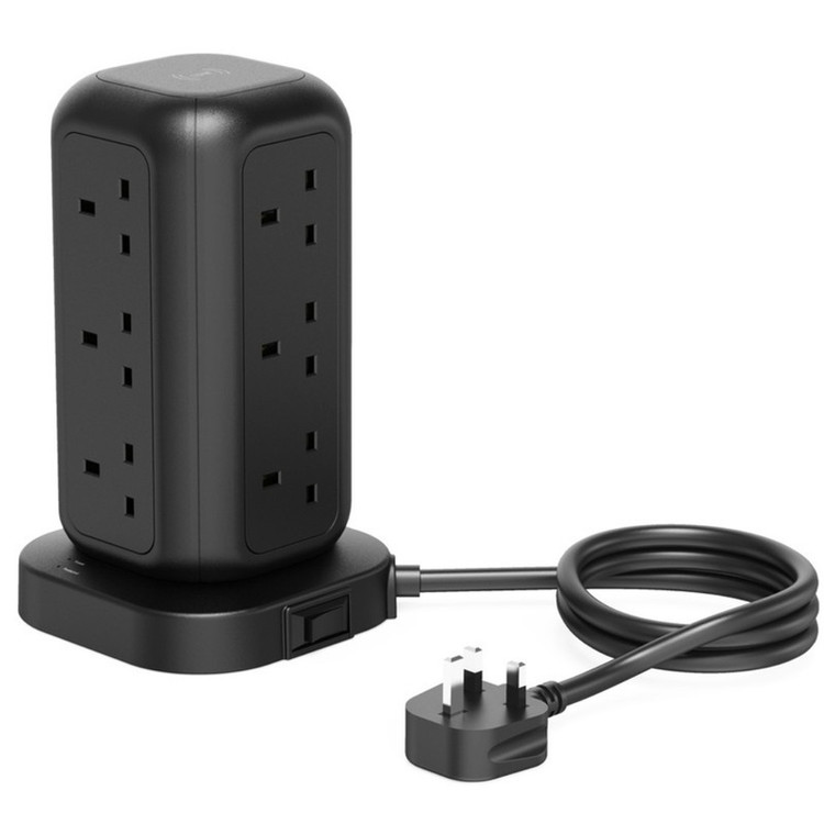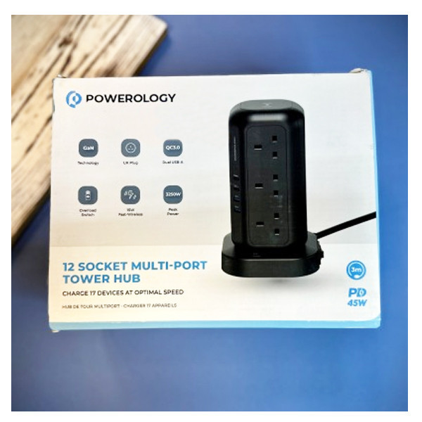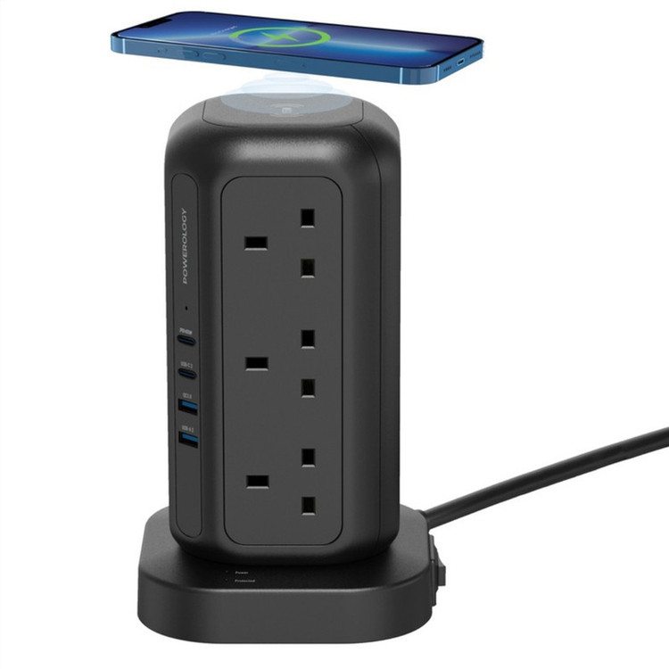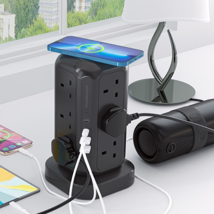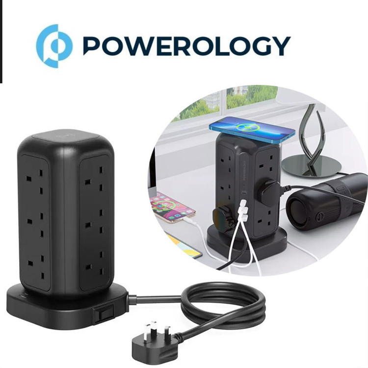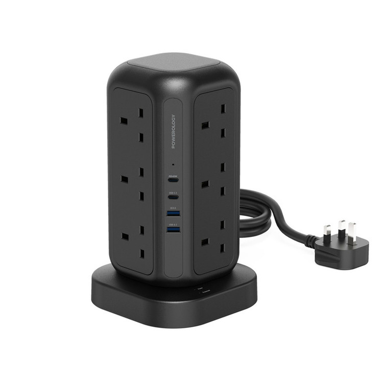 با زیاد شدن دستگاه های الکترونیکی و احتیاج به تامین انرژی آن ها نیاز به چند راهی ها را بیشتر کرده است. چندراهی Powerology 12 Socket Multi-Port PWCUQC013 Tower Hub گزینه مناسبی برای میز کار شماست. این چند راهی علاوه بر 12 خروجی برق، 2 خروجی USB و 2 خروجی Type C هم دارد. شارژر وایرلس 15 واتی در بالای این چند راهی کامل کننده ویژگی های این چند راهی است. برند پاورولوژی یکی از شرکت های کانادایی است که لوازم جانبی دیجیتال با کیفیت و استاندارد جهانی تولید می کند. چندراهی PWCUQC013 در بخش شارژر از فناوری گالیم نیترات GaN بهره گرفته است. دو شاخه اتصال به برق از نوع UK هستند و برای اتصال دوشاخه های ایرانی (EU) و انواع دیگر نیازمند تبدیل هستید. سیم اتصال به برق ضخیم و به طول 3 متر است. برای کنترل جریان برق چندراهی برق یک کلید مرکزی روی بدنه در نظر گرفته شده است. ابعاد چندراهی پاورولوژی برابر 103x103x226 میلیمتر است. حداکثر ولتاژ ورودی برای 12 خروجی برق برابر 250 ولت و حداکثر جریان ورودی 13 آمپر است که موجب شده حداکثر توان این چند راهی به 3250 وات برسد. حداکثر خروجی شارژر وایرلس چندراهی پاورولوژی برابر 15 وات است. پورت Type C اول با پشتیبانی از قابلیت شارژ سریع PD دارای حداکثر توان خروجی 45 وات با جریان / ولتاژ 5V/3A, 9V/3A, 12V/3A, 15V/3A, 20V/2.25A است و در صورتی که هر دو پورت تایپ سی به صورت همزمان مورد استفاده قرار گیرد حداکثر توان خروجی 20 وات می شود. پورت های خروجی USB هر کدام با پشتیبانی از شارژ سریع QC3.0 دارای حداکثر توان 18 وات با جریان / ولتاژ 5V/ 3A, 9V/2A, 12V/1.5A است و در صورت استفاده همزمان از هر دو درگاه USB توان خروجی 12 وات با جریان / ولتاژ 5V/2.4A می شود. شما می توانید همزمان از خروجی های چندراهی استفاده کنید. فقط در نظر داشته باشید در این صورت توان خروجی بین آن ها تقسیم می شود. چندراهی Powerology PWCUQC013 در برابر اضافه بار در مدار محافظت ایجاد می کند و دارای سیستم محافظتی 1700J است. عمق حفره های سوکت برق به اندازه کافی است تا دوشاخه ای که به آن متصل می کنید بیرون نماند.