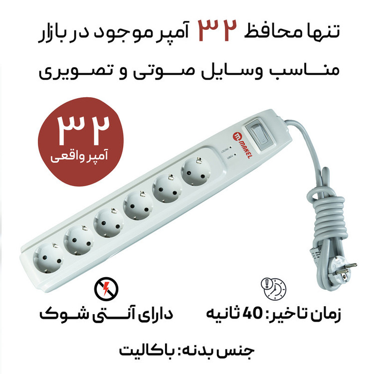 شرکت ماکل همواره با تولید محصولات فوق العاده با کیفیت و طراحی بسیار ظریف شایستگی خود را اثبات کرده این بار با تولید این محافظ یگانگی خود در بازار رو با قدرت اعلام کرده این محافظ تنها محافظ 32 آمپر ایران میباشد و با تاخیر 40 ثانیه ایی کاملا مناسب کامپیوتر و لوازم صوتی تصویری هست