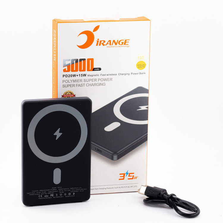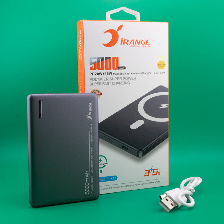 پاوربانک آیرنج مدل IR - X12 با ظرفیت 5000 میلی آمپر ساعت با قابلیت شارژ سریع دو دستگاه میباشد: دارای یک درگاه Type-C دوطرفه و مجهز به پد وایرلس با فناوری Qi، طراحی بصورت مگنتی، دارای پنل وایرلس با خاصیت مغناطیسی جهت چسبیدن به گوشیهایی که فلزی هستند،مجهز به فناوری شارژ سریع PD با حداکثر توان خروجی 20 وات و شارژ گوشیهای دارای فناوری شارژ بی سیم Qi با حداکثر توان خروجی 15 وات، مجهز به تراشه هوشمند داخلی جهت یکسان سازی شدت جریان خروجی متناسب با نوع جریان دستگاه در حال شارژ (شارژ ایمن و بدون آسیب رساندن به دستگاه)، بهرهمندی از تکنولوژی NTC با قابلیت Trickle، در این فناوری، سنسورهای مختلفی استفاده شده که میتواند دما و حرارت دستگاه را بسنجد و سپس با توجه به آن میزان شارژدهی را کنترل کند؛ اگر در حالت فست شارژ سنسورها دمایی غیر طبیعی را تشخیص دهند؛ حالت Trickle فعال میشود که در آن شدت جریان و سرعت کنترل شده تا دما به تدریج متناسب شود و کاهش یابد. برخورداری از کیفیت ساخت عالی، ساخته شده از ترکیب ABS+PC با روکش سیلیکونی جهت جلوگیری از لغزش یا سُر خوردن گوشی، ابعاد 8×65×100 میلیمتر با وزن تنها 125گرم می باشد این ابعاد کوچک سبب شده تا بتوانید براحتی این پاوربانک را حمل کنید. و همینطور دارای چراغ LED برای نمایش میزان شارژ است.دارای ورودی تایپ سی : 5V⎓3A | 9V⎓2A و خروجی تایپ سی: 5V⎓3A | 9V⎓2.22A | 12V⎓1.67A و خروجی وایرالس : ماکزیمم 15W می باشد.