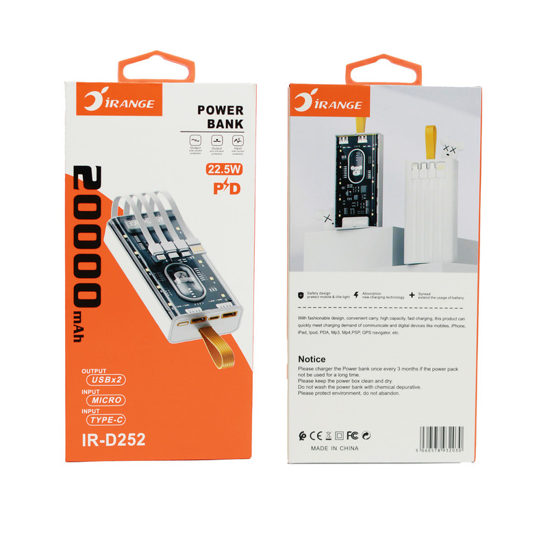 پاوربانک شفاف آیرنج مدل D252 ظرفیت 20000 میلی آمپر با طراحی خلاقانه و شفاف به شما اجازه می دهد تا مدار و چیپ های داخل پاوربانک را ببینید. این پاوربانک دارای 7 خروجی و 2 ورودی می باشد ، وجود 4 کابل یکپارچه متصل به بدنه شما را از حمل کابل شارژ اضافه بی نیاز می کند. این محصول دارای دو پورت خروجی USB با توان 22.5 وات و یک پورت Type-C با توان 20 وات می باشد و از قابلیت شارژ سریع QC و PD پشتیبانی می کند. جنس بدنه این پاوربانک از مواد درجه یک پلاستیک PC و ABS ساخته شده که بسیار مقاوم و ضد ضربه بوده و یک نشانگر LED بر روی بدنه قرار گرفته تا میزان درصد شارژ باتری را نشان دهد. پاوربانک 20000 میلی آمپر ساعتی آیرنج مدل D252 از قابلیت شارژ ایمن پشتیبانی می کند و از دستگاه ها در برابر افزایش دما، اضافه ولتاژ و اتصال کوتاه محافظت می کند. این محصول با تمامی دستگاه ها سازگاری دارد و وزن آن در حدود 440 گرم میباشد. اگر به دنبال یک منبع برق قوی با سرعت شارژ بالا و همچنین دارای چراغ LED برای مسافرت و کمپینگ یا استفاده در فضای باز هستید این پاوربانک گزینه جذابی برای شما به شمار می رود.