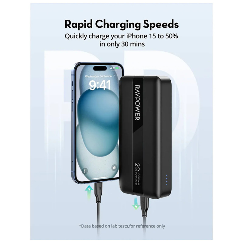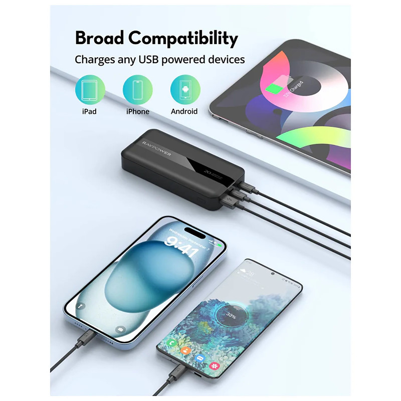 پاوربانک RP-PB1235 دارای باتری 20000 میلیآمپری فوقالعاده است که قادر به شارژ عنوان مختلفی از گوشیها، تبلتها و لپتاپهای مختلف است. این پاوربانک به منظور شارژ انواع دستگاههای مختلف به سه خروجی متفاوت مجهز بوده و بدینخاطر قادر به شارژ همزمان سه دستگاه مختلف است. از میان این سه درگاه، دو عدد از آنها خروجی Type-C با پشتیبانی از فناوری Power Delivery 20W هستند و درگاه دیگر یک خروجی USB-A با حداکثر توان 10V=2.25A است. پشتیبانی این پاوربانک از فناوری Power Delivery به شما اجازه میدهد تا به طور مثال گوشی iPhone 16 را در عرض یک ساعت تا ۸۰ درصد شارژ کنید.