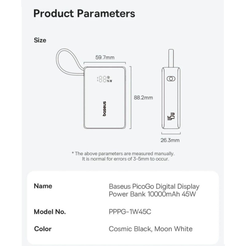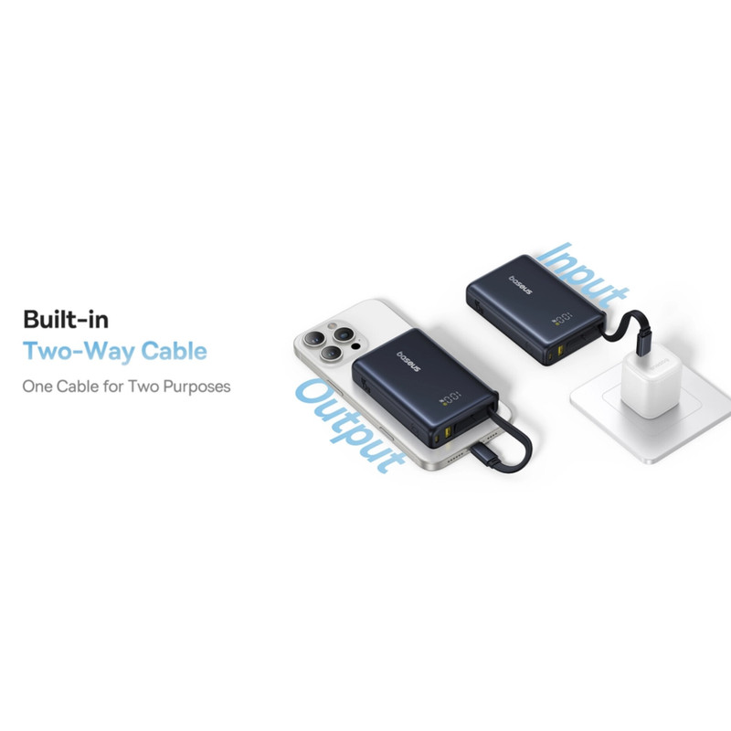 این پاوربانک با ظرفیت 10000 میلی آمپر ساعت، انرژی کافی برای شارژ گوشی، تبلت و حتی هندزفری بلوتوثی شما رو تامین میکنه. تکنولوژی شارژ سریع 45 واتی این پاوربانک به شما این امکان را میدهد که دستگاههاتون رو در کمترین زمان ممکن شارژ کنید. دیگه لازم نیست ساعتها منتظر پر شدن باتری بمونید! همهکاره و هوشمند: پاوربانک PicoGo مجهز به دو پورت خروجی USB و یک کابل Type-C متصل و کاربردی هست. این یعنی میتونید همزمان دو دستگاه رو شارژ کنید و دیگه دغدغه حمل کابل جداگانه رو نداشته باشید. نمایشگر دیجیتال هوشمند: با نمایشگر دیجیتال دقیق این پاوربانک، همیشه از میزان شارژ باقیمونده باخبر باشید. کوچک، اما قدرتمند: طراحی فوقالعاده جمع و جور و سبک این پاوربانک، حمل ان را داخل کیف یا جیب لباس فراهم میکند. PicoGo بهترین انتخاب برای استفاده روزمره، سفر، و هرجایی که به برق دسترسی ندارید. کیفیت و ایمنی تضمین شده: محصولات Baseus همواره به کیفیت ساخت بالا و ایمنی در استفاده معروف هستند. PicoGo هم از این قاعده مستثنی نیست و با اطمینان میتونید از ان استفاده کنید. چرا پاوربانک Baseus PicoGo رو انتخاب کنید؟ * ظرفیت بالای 10000mAh: شارژ چند باره دستگاههای شما * شارژ سریع 45W: صرفهجویی در زمان * کابل Type-C متصل: راحتی و کاربردی بودن * دو پورت خروجی USB: امکان شارژ همزمان چند دستگاه * نمایشگر دیجیتال: اطلاع دقیق از میزان شارژ * طراحی جمع و جور و قابل حمل: مناسب برای هر مکان * کیفیت ساخت بالا و ایمنی: اطمینان در استفاده