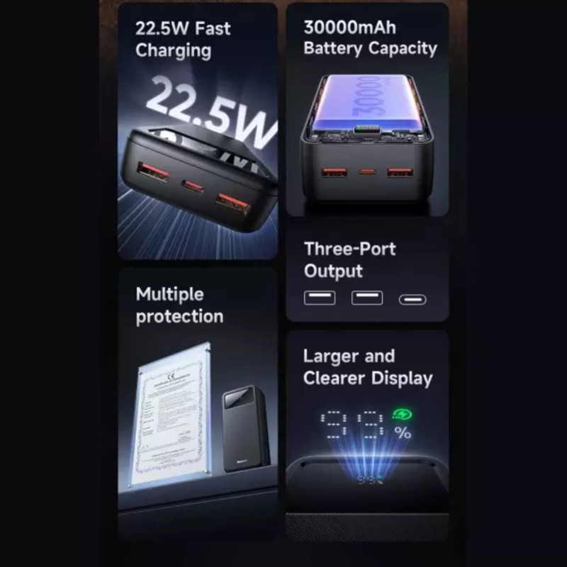 این پاور بانک باطراحی ساده از مواد با کیفیت ساخته شده . این پاور بانک با ظرفیت 30000 میلی آمپر است. دارای سه پورت داخلی و خارجی با قدرت 22.5 وات است.