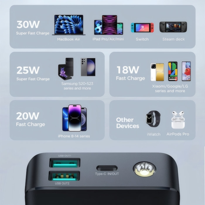 طراحی شیک و مقاوم | فناوری شارژ سریع PD 30W | پشتیبانی از PD 3.0، QC 3.0، PPS و SCP | مجهز به یک چراغقوه داخلی
