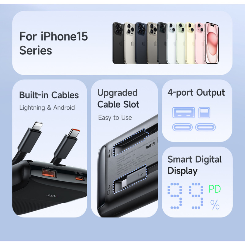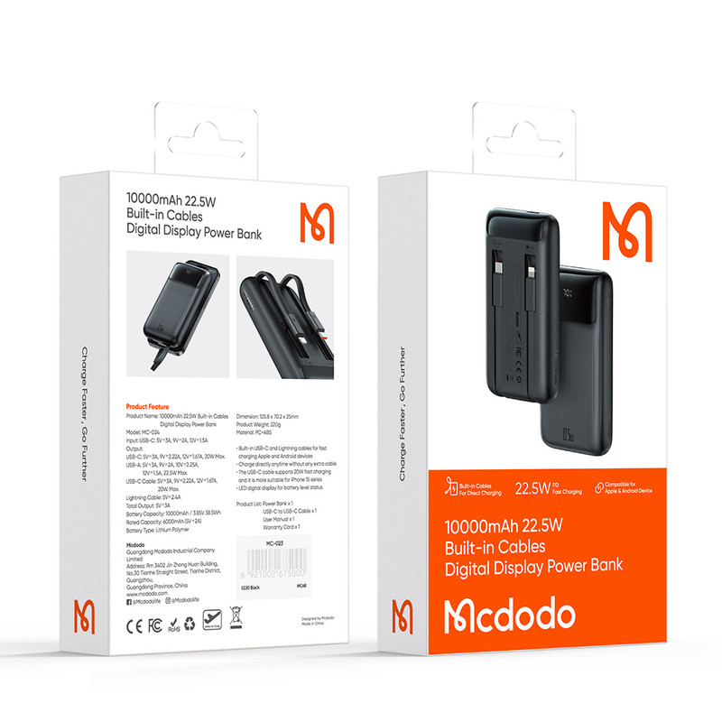 پاوربانک مک دودو مدل MC-024 یک انتخاب بینظیر برای افرادی است که به دنبال یک دستگاه قابلحمل، قدرتمند، و چندکاره هستند. این پاوربانک با ظرفیت 10000 میلیآمپر ساعت و طراحی جمعوجور، به شما اجازه میدهد تا همیشه و همهجا دستگاههای الکترونیکی خود را با خیالی آسوده شارژ کنید. تجربهای بینظیر از شارژ سریع: یکی از مهمترین ویژگیهای این پاوربانک، توان شارژ سریع 22.5 وات آن است که باعث میشود دستگاههای شما با سرعتی باورنکردنی شارژ شوند. در عرض تنها 30 دقیقه میتوانید گوشی آیفون یا هر دستگاه اندرویدی را تا 60 درصد شارژ کنید. این پاوربانک از پروتکلهای شارژ سریع PD (Power Delivery) و QC (Quick Charge) پشتیبانی میکند، به این معنا که با جدیدترین دستگاهها نیز کاملاً سازگار است. چه در حال سفر باشید، چه در یک جلسه کاری مهم، دیگر نگرانی بابت تمام شدن شارژ نخواهید داشت! دو کابل داخلی، همه نیازهای شما را رفع میکند: یکی از نقاط قوت این پاوربانک، وجود دو کابل داخلی USB-C و Lightning است. این ویژگی منحصربهفرد باعث میشود که همیشه کابل مورد نیاز برای شارژ دستگاههای اپل و اندروید را در دسترس داشته باشید، بدون نیاز به حمل کابلهای اضافی. این طراحی هوشمندانه، راحتی فوقالعادهای را به شما ارائه میدهد و به شما اجازه میدهد تا به سرعت دستگاههای مختلف خود را شارژ کنید. شارژ همزمان چند دستگاه: آیا نیاز دارید همزمان چند دستگاه را شارژ کنید؟ پاوربانک MC-024 با داشتن 4 خروجی، امکان شارژ همزمان چهار دستگاه را فراهم میکند. این دستگاه میتواند آیفون، تبلت، هدفون بیسیم، و ساعت هوشمند شما را همگی بهطور همزمان و سریع شارژ کند. به لطف این ویژگی، دیگر نیازی به منتظر ماندن برای شارژ هر دستگاه به صورت جداگانه نخواهید داشت. طراحی زیبا و بادوام: این پاوربانک نه تنها قدرتمند است، بلکه با طراحی ظریف و بدنهای از جنس ABS و PC مقاوم، بهعنوان یک محصول با دوام و شیک شناخته میشود. ابعاد کوچک و وزن سبک (تنها 220 گرم) آن را به گزینهای ایدهآل برای قرار گرفتن در کیف یا جیب شما تبدیل کرده است. همچنین، نمایشگر LED دیجیتال آن به شما امکان میدهد وضعیت باتری را به راحتی مشاهده کنید، تا همیشه از میزان شارژ باقیمانده آگاه باشید
