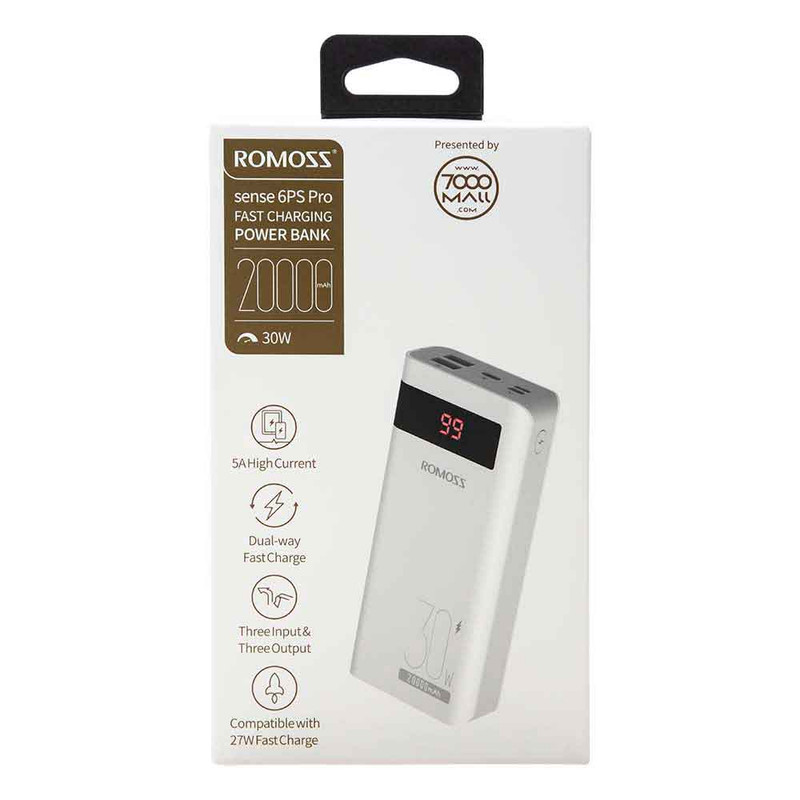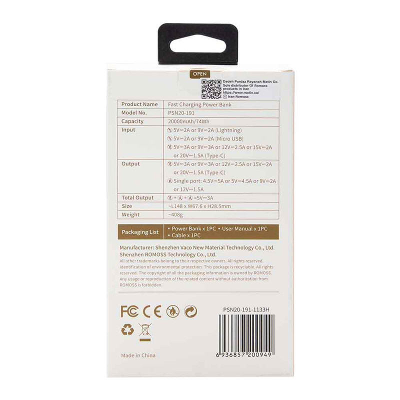 پاوربانک 20000mAh روموس مدل PSN20-191 یکی از گزینههای قدرتمند و کارآمد برای شارژ دستگاههای هوشمند در طول روز است. این پاوربانک با ظرفیت بالا، طراحی مدرن و قابلیت شارژ سریع،توانسته تعادل خوبی بین عملکرد، ایمنی و قیمت ایجاد کند.پاوربانک PSN20-191 دارای 5 پورت میباشد که شامل 1 پورت مشترک ورودی/خروجی تایپ سی، 1 پورت ورودی لایتنینگ، 1 پورت ورودی Micro-USB و 2 پورت خروجی USB-A است. پورتهای ورودی به همراه نرخ ولتاژ و جریان آن عبارتند از:پورت Type-C ورودی: 5V/3A – 9V/3A – 12V/2.5A – 15V/2A – 20V/1.5A و پورت لایتنینگ ورودی: 5V/2A – 9V/2A و پورت Micro-USB ورودی: 5V/2A – 9V/2A همچنین نرخ ولتاژ و جریان پورتهای خروجی این کالا نیز عبارتند از: پورت USB-A1/A2 خروجی: 4.5V/5A – 5V/4.5A – 9V/2A – 12V/1.5Aو پورت Type-C خروجی: 5V/3A – 9V/3A – 12V/2.5A – 15V/2A – 20V/1.5A این پاوربانک با حداکثر توان خروجی 30 وات دارای نمایشگر LCD دیجیتال جهت نمایش میزان شارژ است. همچنین این محصول دارای وزن 408 گرم است که در کلاس وزنی پاوربانکهای سبک قرار دارد. ابعاد این شارژر همراه نیز 148 × 67.6 × 28.5 میلیمتر است.این پاوربانک در رنگ سفید با ظرفیت 20000 میلی آمپر دارای باتری لیتیوم پلیمری است. همچنین این کالا از رویه ضد خش و جنس بدنه آن نیز پلاستیک ABS است که مهمترین خاصیت آن ضد اشتعال بودن کالاست. از اقلام همراه این پاوربانک فست شارژ نیز میتوان به دفترچه راهنما و کابل شارژر تایپ سی اشاره کرد.