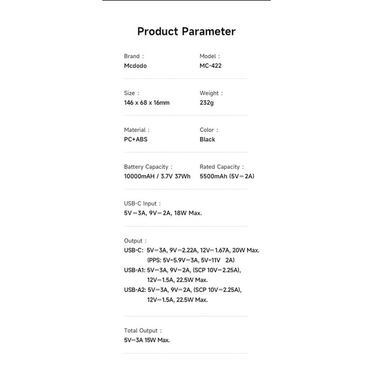 پاوربانک مک دودو مدل MC-4420 LED Display Version ظرفیت 10000 میلی آمپرساعت