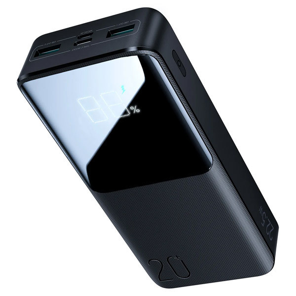 پاوربانک 20000 جویروم Joyroom JR-QP192 Power Bank 20000mAh توان 22.5 وات همراه داشتن پاوربانک امروزه به امری واجب تبدیل شده است اگر بخواهید با گوشی خود مدت زمان زیادی کار کنید.اگر شما قصد خرید یک پاوربانک را دارید حتما باید از قبل نیاز خود را شناسایی کرده باشید تا در انتخاب آن به مشکل بر نخورید. پاوربانک جویروم JR-QP192 با پورتهای مختلفی که دارد، امکانات خوبی را برای کاربران فراهم کرده که در ادامه به نقدی و بررسی آن خواهیم پرداخت. مشخصات پاوربانک Joyroom JR-QP192 پاوربانک جویروم JR-QP192 از جنس پلاستیک ABS و پلاستیک ضد حریق PC ساخته شده است که مقاومت بالای دارد. این پاوربانک دارای ابعاد 150x69x41 میلی متر بوده و وزنی حدود 500 گرم دارد. بر روی پاوربانک Joyroom JR-QP192 یک نمایشگر LED تعبیه شده که به شما میزان شارژ و اتصال را نشان می دهد. در قسمت بالای این محصول درگاه های پاوربانک Joyroom JR-QP192 وجود داشته که 2 درگاه ورودی (Type C ,Micro) و 3 درگاه خروجی (Type C ,USB1 ,USB2) می باشند؛ قابل ذکر است درگاه تایپ سی (Type C) درگاه مشترک بوده که هم قابلیت ورودی داشته و هم قابلیت خروجی دارد. به این معنی که می توانید پاوربانک را از طریق درگاه تایپ سی شارژ کرد و یا از درگاه تایپ سی برای شارژ دستگاه های خود استفاده کنید. در قسمت کناری این پاور بانک نیز دکمهی پاور برای روشن خاموش کردن دستگاه تعبیه شده است. ظرفیت اسمی این پاوربانک، معادل 20000mAh است؛ ولی باید توجه داشته باشید که متناسب با ولتاژ گوشی شما این ظرفیت تغییر خواهد کرد. برای مثال بازدهی باتری این پاوربانک، برابر با 12000mAh در ولتاژ 5 ولت (5V/3A) می باشد. تکنولوژی شارژ سریع QC و PD پاوربانک جویروم JR-QP192 از تکنولوژی شارژ سریع PD3.0 QC3.0, AFC, FCP, SCP, PE پشتیبانی می کند؛ و شما می توانید با استفاده از این درگاه ها دستگاه های (یک یا چند دستگاه) خود را با سرعت بالا شارژ کنید. باید توجه داشته باشید که در هنگام شارژ همزمان چندین دستگاه توان خروجی این پاوربانک بین پورت ها تقسیم خواهد شد. برای شارژ سریع نیاز است که دستگاه شما از این تکنولوژی پشتیبانی کند.