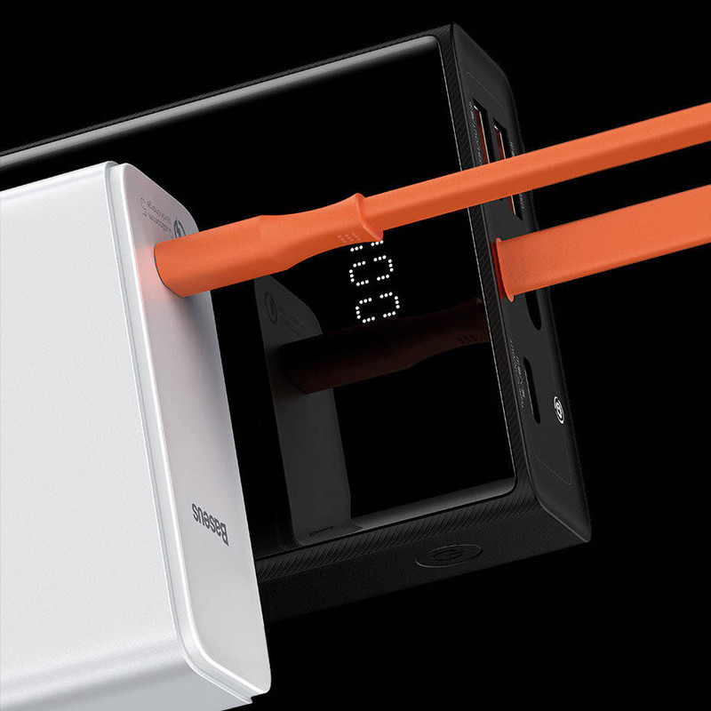 چه چیزی بهتر از یک پاوربانک با کابل متصل که زحمت جا به جایی شارژر را برایتان کم میکند؟ پاروبانک فست شارژ بیسوس Baseus Elf Digital Display 20000mAh Power Bank دارای یک کابل تایپ سی متصل است که همیشه همراهتان خواهد بود. توان کلی این پاوربانک 65 وات اعلام شده و دارای سه پورت است.همانطور که گفتیم یک کابل نارنجی رنگ به پاوربانک 20000 بیسوس Elf متصل است که از نوع Type-C میباشد. قابلیت مهم این کابل این است که علاوه بر شارژ کردن خود پاوربانک (ورودی)، میتواند گوشی شما را هم شارژ کند (خروجی). شارژپاوربانک با یک آداپتور مناسب تنها 90 دقیقه طول میکشد.