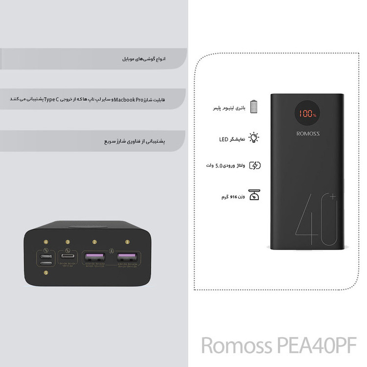 پاوربانک این روزها یکی از کاربردیترین وسایلی است که هر فردی باید یکی از آنها را در کنار وسایل الکترونیکی خود داشته باشند. برخلاف تصور عده زیادی که فکر میکنند پاوربانکها تنها قابلیت شارژ گوشی و تبلت یا به طور کلی وسایلی با ظرفیت باتری پایین را دارند؛ پاوربانکهایی وجود دارد که قادر به تأمین شارژ مورد نیاز لپتاپ نیز هستند. این دسته از شارژهای همراه باید ظرفیت باتری بسیار بالایی داشته باشند تا بتوانند لپتاپها را که از باتریهای قوی بهره میبرند را شارژ کنند. شارژر همراه روموس مدل PEA40PF یک پاروبانک کارا و چند کاره برای شارژ گوشی و لپتاپ است. این مدل دارای باتری لیتیوم پلیمری با ظرفیت 40000 میلیآمپر ساعت است که قابلیت شارژ Macbook Pro و سایر لپتاپهایی که از خروجی Type C پشتیبانی میکنند را دارد. به واسطه این ظرفیت از باتری که قابلیت شارژ کردن لپتاپ را نیز دارد؛ این پاوربانک دارای وزن سنگین و در حدود 916 گرم است.