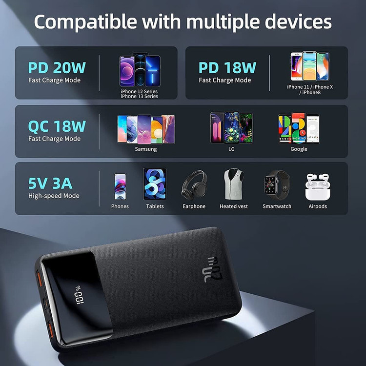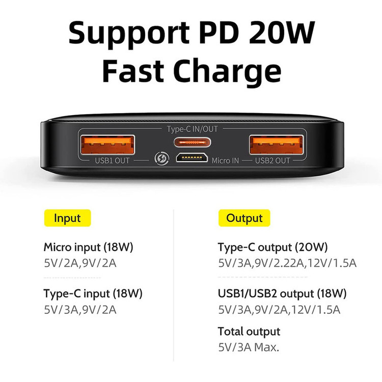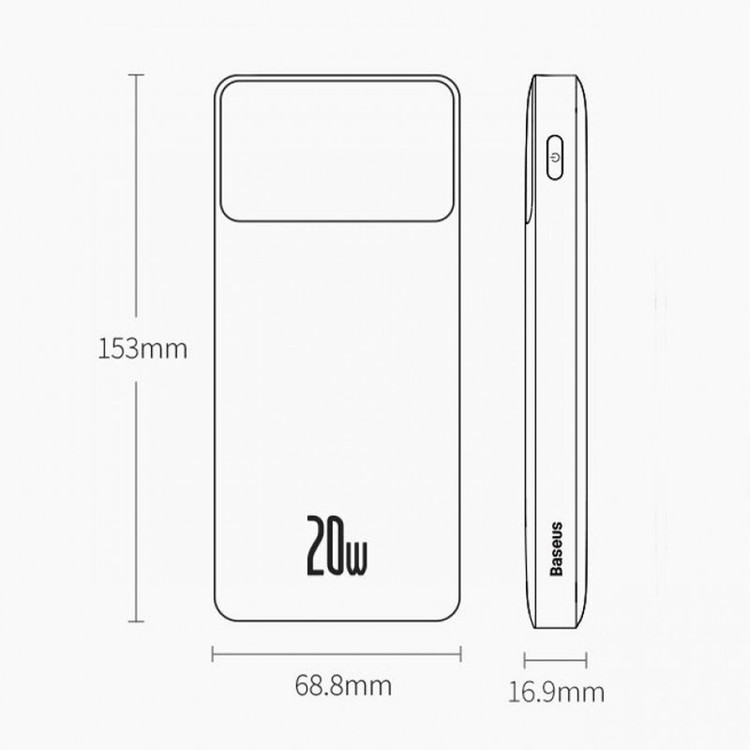 پاور بانک فست شارژ مدل PPBD10K در رنگ های متفاوت عرضه شده است که کد PPDML-L01 بیانگر رنگ مشکی و کد PPDML-L02 بیانگر رنگ سفید می باشد. پاوربانک مدل PPBD10K محصولی از برند معتبر باسئوس می باشد که از بدنه ای به جنس پلاستیک ABS و پلی کربنات ضد حرارت مقام در برابر ضربه، فشار و … ساخته شده است. دو پورت خروجی USB و یک درگاه خروجی مشترک Type-C به منظور شارژ گوشی های موبایل و دیگر گجت های هوشمند با حداکثر شدت جریان عبوری 3 آمپر در 5 ولت بر روی بدنه این دستگاه وجود دارد. این شارژر همراه با بهره مندی از توان کلی 20 وات و باتری لیتیوم پلیمری به ظرفیت 10000 میلی آمپر ساعت، می تواند سه دستگاه مختلف را به صورت همزمان با پشتیبانی از فناوری شارژ سریع در مدت زمان کوتاه و به شکل مطمئن شارژ نماید. همچنین جهت شارژ خود پاوربانک، یک درگاه ورودی MicroUSB با حداکثر شدت جریان 2 آمپر در 5 ولت و یک پورت مشترک ورودی / خروجی Type-C با حداکثر شدت جریان 3 آمپر در 5 ولت درنظر گرفته شده است. Baseus فناوری Power Delivery و چیپست هوشمندی را نیز برای عملیات شارژ ایمن در پاور بانک فست شارژ PPDML-L فراهم کرده که با تشخیص و متناسب سازی شدت جریان موردنیاز دستگاه های متصل شده از باتری آنها در برابر بار اضافی، نوسانات ولتاژی، اتصالات کوتاه و … محافظت خواهد کرد. یکی دیگر از قابلیت های کاربردی این شارژر همراه، پشتیبانی از فناوری NTC می باشد که با بررسی و تنظیم میزان دما و حرارت تولیدی متناسب در زمان استفاده، از آسیب دستگاه ها در برابر گرمای بیش از حد جلوگیری می کند. نمایشگر LED جهت اطلاع وضعیت شارژ باتری به صورت درصدی و یک کلید فیزیکی به منظور روشن و خاموش کردن دستگاه نیز بر روی بدنه این ابزار جانبی وجود دارد.