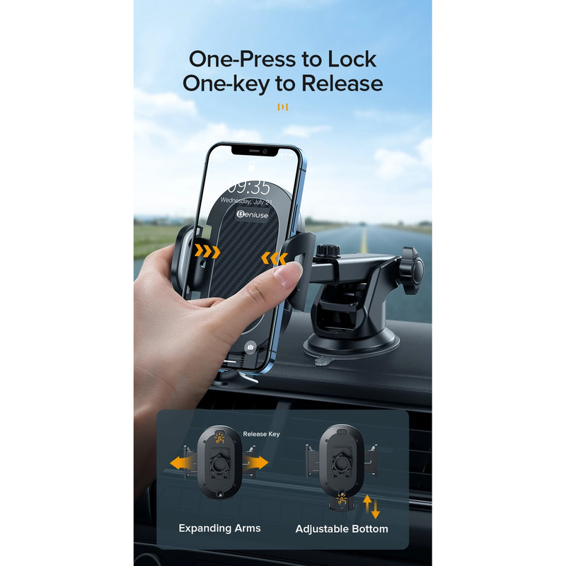 پایه نگهدارنده موبایل بنیوس مدل BE-MH01 به گونهای طراحی شده است که در برابر تکانهای شدید خودرو و حرارت داخل خودرو انعطاف پذیر و مقاوم است. این هولدر امکان نصب بر روی داشبورد یا شیشه خودرو را برای شما فراهم میکند.همچنین برای تقویت حالت ایستایی دارای گیره افزایش وکیوم در محل نصب است.طراحی ارگونومیک به شما این امکان را میدهد فقط با یک دست تلفن همراه خود را بر روی هولدر قرار دهید یا بردارید.دهانه نکهداره گوشی تلفن همراه دارای دکمه آسان باز شو در پشت آن است که با فشار دادن آن دهانه به صورت اتوماتیک باز میشود.تغییرات دهانه از 55 تا 95 میلیمتر است. دهانه نگهدارنده دارای امکان چخش 360 درجه را دارد و این امکان را فراهم میکند که گوشی را با هر زاویهای که دوست دارید روی آن تنظیم کنید.طول بدنه هولدر به صورت تلسکوپی وقابل تغییر است و این امکان را میدهد که گوشی را به خود نزدیک یا دور نمایید و تغییر زاویه 240 درجه داشته باشید.جنس بدنه از ABS و EVA درجه یک است.