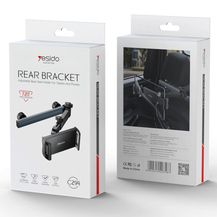 نگهدارنده موبایل و تبلت گیره ای یسیدو مدل C294 محصولی از کارخانه یسیدو است.وجود دو گیره در قسمت انتهایی جهت اتصال به صندلی عقب خودرو با قابلیت اتصال در محدوده ی 1 الی 16 سانتی متر است.دارای قابلیت چرخش 360 درجه براکت جهت دسترسی آسان به گوشی موبایل و زاویه دید بهتر به صفحه نمایش است.مناسب برای گوشی موبایل و تبلت در سایز 4 الی 11 اینچ، دارای پایه با قابلیت تنظیم ارتفاع و تا شدن است.بدنه ساخته شده از جنس پلاستیک ABS و سیلیکون، مقاوم در برابر فشار و ضربه های احتمالی است.
