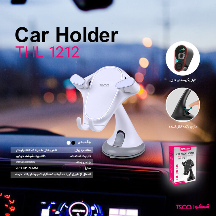 پایه های نگهدارنده یا همان هولدر ها کاربرد عمومی داشته و نه تنها برای گوشی موبایل استفاده می شوند بلکه میتوان از آنها برای نگهداری موقعیتیاب های GPS و موزیک پلیر ها هم استفاده کرد. پایه نگهدارنده تسکو مدل TH 1212 با داشتن حالت کشویی امکان قرار دادن گوشی های مختلفی را فراهم می کند. یعنی با باز و بسته شدن براکت های کشویی که در دو طرف و قسمت پایینی نگهدارنده وجود دارد می توان گوشی های مختلفی درون پایه قرار داد. جنس بدنه TH 1212 ترکیبی از پلاستیک ABS و سلیکون میباشد که مقاومت آن را بسیار بالا برده است . همچنین در قسمت انتهایی پایه این محصول یک بادکش لاستیکی وجود دارد ، که قابلیت نصب بر روی داشبورد و یا شیشه جلوی اتومیبل را فراهم می کند .