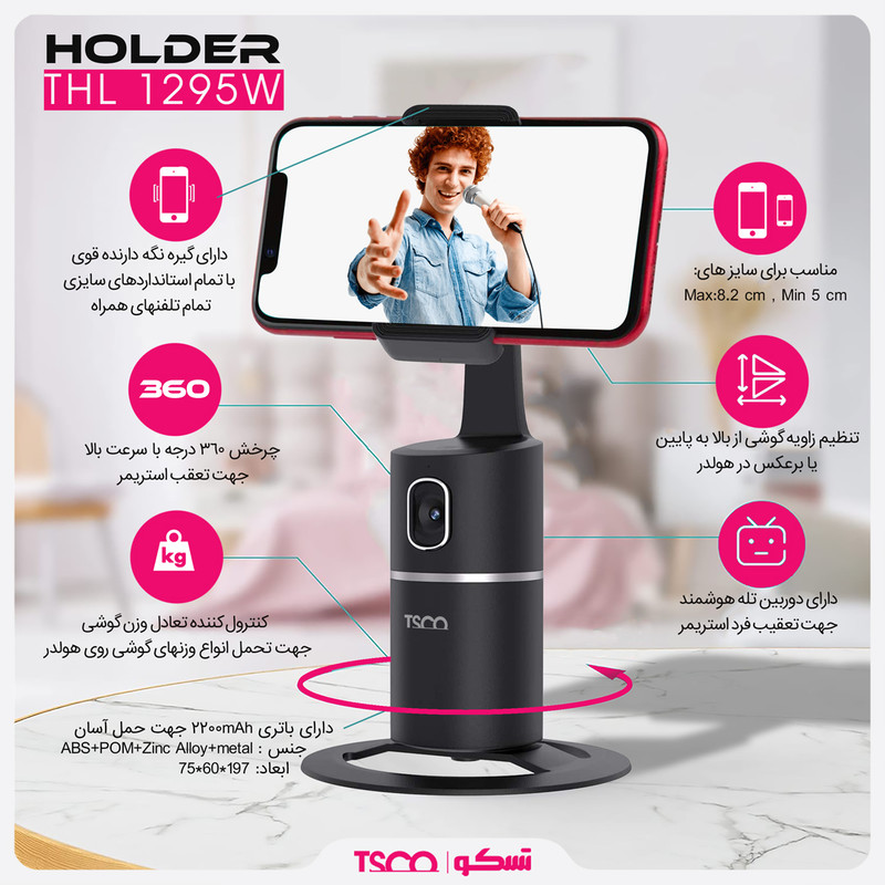 این هولدر مجهز به دوربین تله هوشمند برای تعقیب سوژه یا تشخیص چهره بوده و به عنوان یکی از ابزار کاربردی برای تولیدکنندگان محتوا استفاده میشود. هولدر تسکو مدل THL 1295 محصولی هوشمند و کارآمد برای عموم مردم به حساب می آید. این محصول کاربردی تسکو در ابعاد مناسب و جمع و جور با گیره های نگه دارنده قدرتمند،در رنگ مشکی ارائه شده که برای انواع سایزهای موبایل قابل استفاده است. هولدر موبایل THL 1295 با ایجاد تعادل قادر به تحمل انواع وزنهای موبایل است، بدلیل بهرهمندی از باطری قوی و قابل شارژ، برای حمل هولدر تسکو مدل THL 1295 دچار مشکل نخواهید شد و فقط کافیست به مدت 5 ساعت بواسطهی یک کابل شارژ TYPE-C برای شارژ این محصول به آن زمان دهید و سپس تا ساعتها از کار کردن با آن لذت ببرید. قابلیت چرخش 360 درجه، تنظیم زاویه گوشی از بالا به پایین و یا برعکس، مجهز بودن به یک دوربین تله هوشمند جهت تشخیص چهره و تعقیب استریمر از دیگر مزیتهای هولدر THL1295 است.