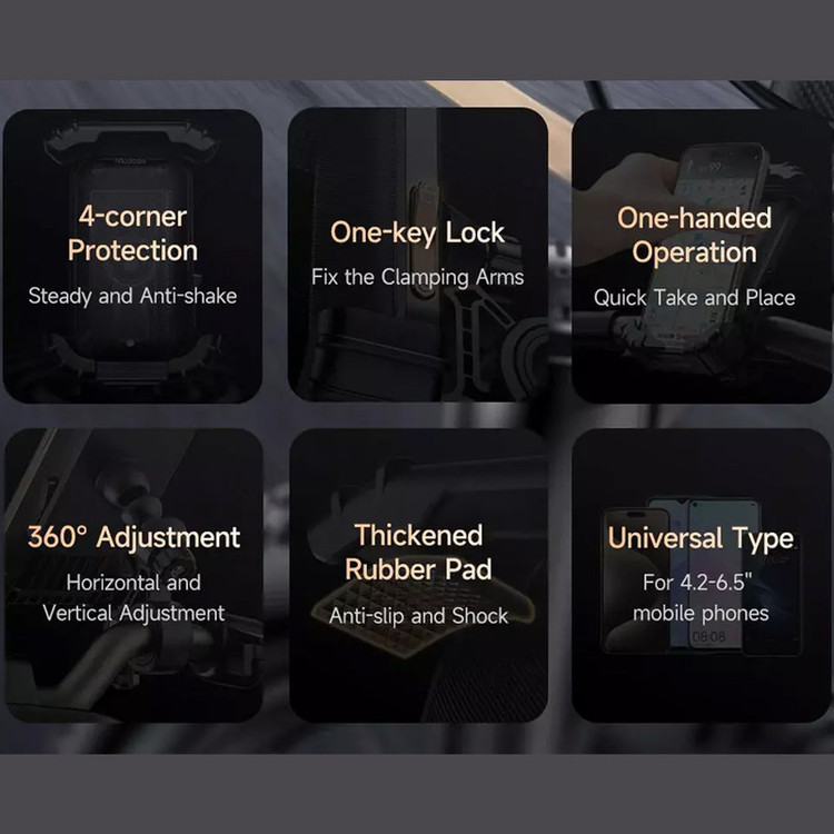 قابل استفاده برای گوشیهای 4.2 تا 6.5 اینچ | دارای قابلیت چرخش 360 درجه | ضد لغزش و ضد شوک | دارای قفل باز و بسته کردن | قابلیت استفاده سریع و آسان با یک دست | قابل نصب رو فرمان دوچرخه و موتور سیکلت
