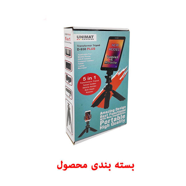 Unimat D-930 محصولی جدید از برند Unimat با امکانات بیشتر و ویژه نسبت به مدل های پیشین خود است . این مدل دارای یک عدد هد با قابلیت تغییر زاویه است که علاوه بر دکمه تنظیم سه پایه، می توانید به صورت جداگانه به تجهیزات متصل بر روی هد ( همچون موبایل ، دوربین های کامپکت ، پنل های ال ای دی ، میکروفون و … ) نیز زاویه افقی و عمودی بدهید. بر روی نگهدارنده موبایل این مدل می توانید گوشی های با عرض 55 میلیمتر تا 95 میلیمتر را قرار دهید. این سه پایه با استفاده از پایه L شکل امکان عکاسی افقی و عمودی را نیز به شما می دهد. از مزیت های اسم محصول نسبت به مدل های قبلی داشتن جای پیچ های فلزی است که مانع از هرز شدن جای پیچ در استفاده های طولانی مدت می شود. همچنین با استفاده از دو عدد از این پکیج نیز می توانید لپ تاپ خود را بر روی آن بگذارید حتما باید برای قرار گیری لپ تاپ دو عدد خریداری شود این محصول شامل یک سه پایه است . اقلام همراه :سه پایه ، هولدر L شکل ، هولدر موبایل ، بال هد،خشاب و برچسب و پیچ است مراحل نصب بدین صورت است در ابتدا چسب دو طرفه را درون خشاب نگهدارنده تبلت گذاشته نگهدارنده تبلت را درون هولدر موبایل فیکس کنید و آن را بر روی هد قابل تنظیم سه پایه پیچ کنید. از یک سمت برچسب می توانید انواع تجهیزات همچون تبلت،ماشین حساب و … را بر روی سه پایه قرار دهید.