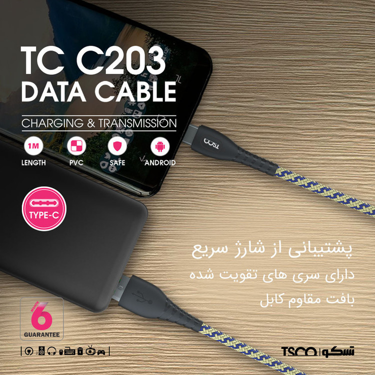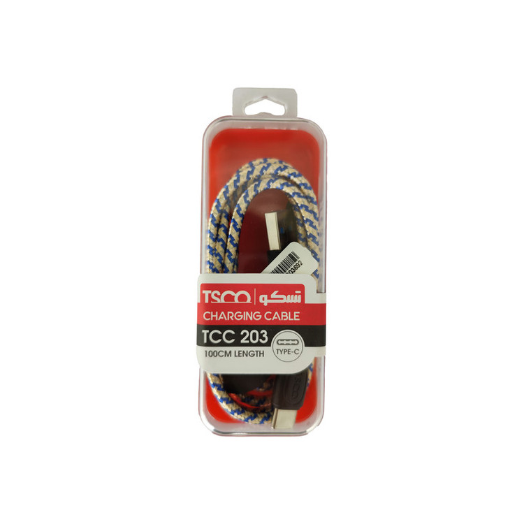 کابل TCC 203 برند تسکو 1 متر طول دارد و رشتههای مسی آن با استفاده از cotton braided پوشانده شدهاند. این روکش مقاومت زیادی دارد و رشتههای مسی داخل کابل را در برابر قطعشدن براثر کشیدن ، خم شدن و گره خوردن مقاوم کرده است؛ کانکتورهای به کاررفته در این کابل TCC 203 بسیار مقاوم هستند. در یک سمت این کابل یک کانکتور Type C و در سمت دیگر آن یک کانکتور USB برای اتصال به شارژر و کامپیوتر برای انتقال اطلاعات وجود دارد. شما میتوانید از کابل TCC 203 برای شارژ و انتقال اطلاعات میان دستگاههای مختلف به راحتی استفاده کنید.