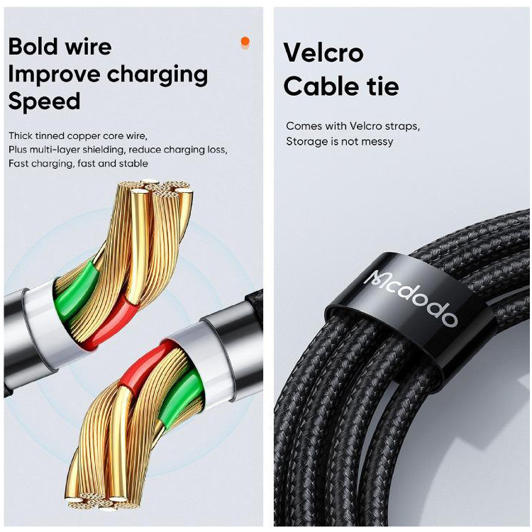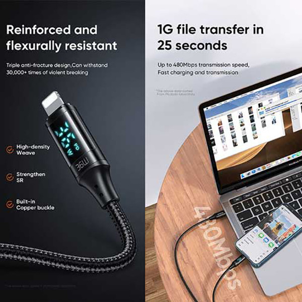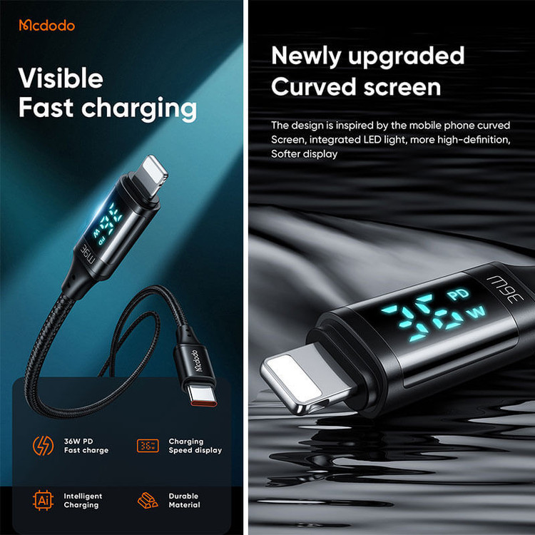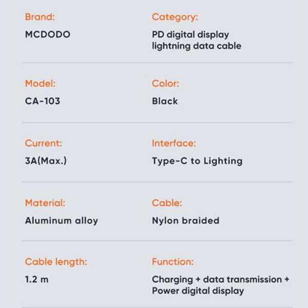 کابل شارژ و دیتا تایپسی به لایتنینگ مک دودو کابل Type-C به Lighting مک دودو تمام گوشیهای سری 11 تا 13 اپل، آیفون x و آیفون 8 را در کمترین زمان ممکن شارژ میکند. بهجز این میتوانید برای انتقال سریع اطلاعات نیز روی CA-1030 حساب کنید. برای افزایش استحکام این کابل دربرابر مواردی همچون کشش، ضربه، فشار، سایش، زنگزدگی، خمش، گرهخوردگی و...، از سه لایه محافظ، روکشی از جنس نایلون بافتهشده و آلیاژ آلومینیوم و طراحی ویژهی SR برای ساخت کانکتورهای آن استفاده شدهاست.