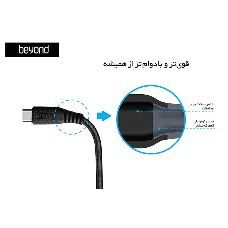 کابل شارژ بیاند مدل BUC-201 USB-C از جنس رشتههای مسی ساخته شده و دارای روکش بافته شده از الیاف نایلون است. این کابل کاملاً استاندارد بوده و به دلیل جلوگیری از جریانات مرتعش، در استفاده طولانی مدت به باتری دستگاه شما صدمهای وارد نمی کند. جنس هسته این کابل از مس است و وجود 4 مجموعه سیم مسی در این کابل باعث میشود که علاوه بر شارژ سریع، امکان انتقال اطلاعات را نیز داشته باشید. به سبب داشتن روکش بافته شده از الیاف نایلون و استفاده از کابلهای مسی با کیفیت، قابلیت انعطافپذیری تا 360 درجه و عمر بیش از 10,000 بار تا شدن را دارد و با خم شدن مداوم به بدنهی کابل آسیبی وارد نمی شود. روکش بافته شده از الیاف نایلونی دوام بالاتری نسبت به کابلهای لاستیکی دارد و با استفاده مداوم دچار بریدگی یا تاشدگی در طول کابل نمی شود.