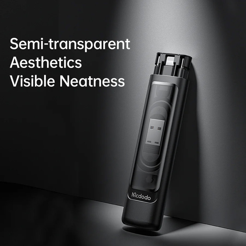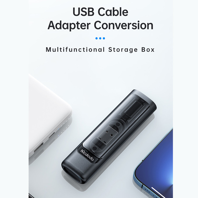 برند مک دودو با تمرکز بر تکنولوژی های پیشرفته در زمینه تولید شارژر و لوازم جانبی موبایل، محصولاتی با کیفیت و ایمنی بالا و کارایی مطلوب ارائه می دهد. مک دودو توانسته است جایگاه ویژه ای در بازار جهانی به دست آورد و محصولات متنوعی مانند کابل ها، شارژرها، پاوربانک ها و لوازم جانبی دیگر را به کاربران عرضه کند. کابل تبدیل USB-C/USB به Lightning، USB-C، Micro USB مک دودو مدل Box با طول 0.29 متر، با تمرکز بر چند کاره بودن طراحی شده است و محصولی چند منظوره است و می تواند تمام نیاز های شما به داشتن کابل های متعدد را رفع کند. داخل این باکس چند منظوره مک دودو، یک کابل تایپ سی به تایپ سی با طول 29 سانتی متر، یک تبدیل Type-C به لایتنینگ (آیفونی)، یک تبدیل Type-C به USB، یک تبدیل Type-C به میکرو (Micro USB) و یک سوزن سیم کارت وجود دارد. قابل ذکر است تبدیل ها به کانکتور تایپ سی متصل خواهند شد. شما با استفاده از این تبدیل ها و کابل می توانید تمام دستگاه های موجود را به سیستم و یا آداپتور خود متصل کنید و به انتقال اطلاعات و یا شارژ بپردازید. شما می توانید در حالت های مختلف از این کابل و تبدیلها استفاده کنید. بعلاوه دو محفظه برای قرار دادن سیم کارت و کارت حافظه (TF) در داخل این باکس طراحی شده که باعث می شود شما بتوانید سیم کارت و مموری کارت خود را داخل این باکس گذاشته و با خود حمل کنید. جنس این محصول از پلاستیک محکم ABS و PC بوده که مقاوم و سبک است و دارای ابعاد 107*31*17.5 میلی متر بوده و وزنی حدود ۴۰ گرم دارد که به راحتی می توانید آن را حمل کنید و در داخل کیف و یا جیب خود بگذارید و از به همراه داشتن چندین کابل متعدد بی نیاز شوید. کابل تبدیل USB-C/USB به Lightning، USB-C، Micro USB مک دودو مدل Box با طول 0.29 متر، یک پک کابل چند منظوره است که از قابلیت فناوری شارژ سریع SCP - AFC - OPPO - VOOC - VIVO QC2.0 - QC3.0 - QC4.0,PD پشتیبانی می کند، شدت جریان خروجی این کابل نیز 3 آمپر است.
