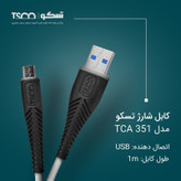 کابل TCA 351 برند تسکو 1 متر طول دارد و رشتههای مسی آن با استفاده از روکشی بافتهشده پوشانده شدهاند. این روکش مقاومت زیادی دارد و رشتههای مسی داخل کابل را در برابر قطعشدن براثر کشیدن ، خم شدن و گره خوردن مقاوم کرده است؛ کانکتورهای به کاررفته در این کابل TCA 351 بسیار مقاوم هستند. در یک سمت این کابل یک کانکتور اندروید و در سمت دیگر آن یک کانکتور USB وجود دارد. همچنین کانکتور USB آن با کامپیوتر، لپتاپ، شارژرهای دیواری، پاوربانک و دیگر دستگاههای دارای این درگاه سازگار است.همچنین شما میتوانید از TCA 351 برای شارژ و انتقال اطلاعات میان دستگاههای مختلف استفاده کنید.