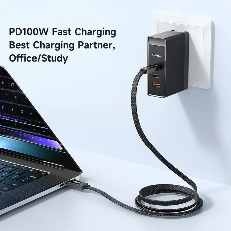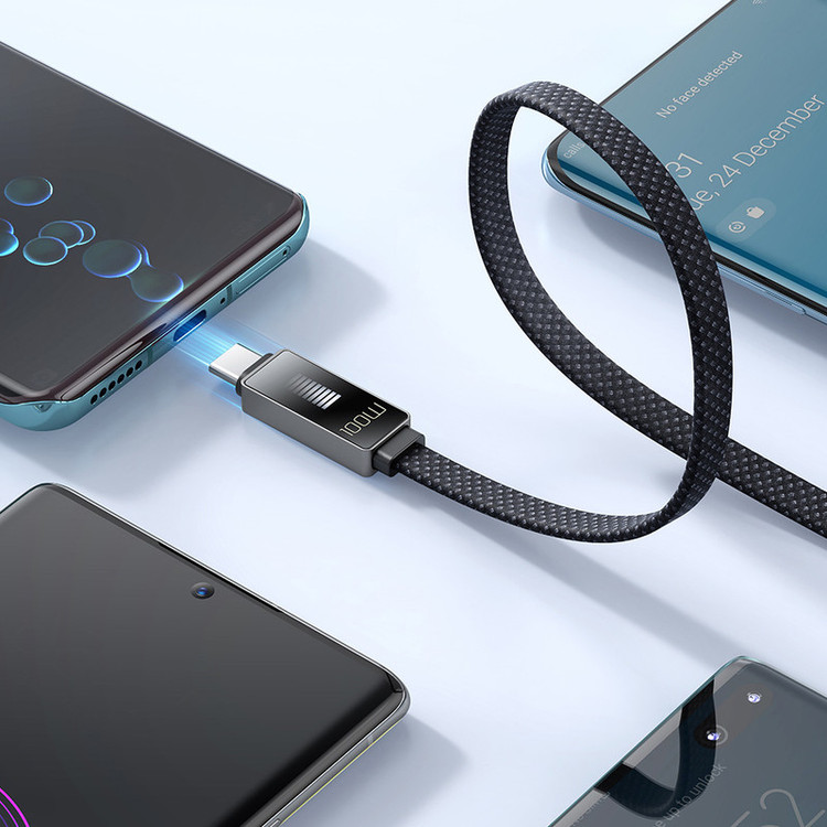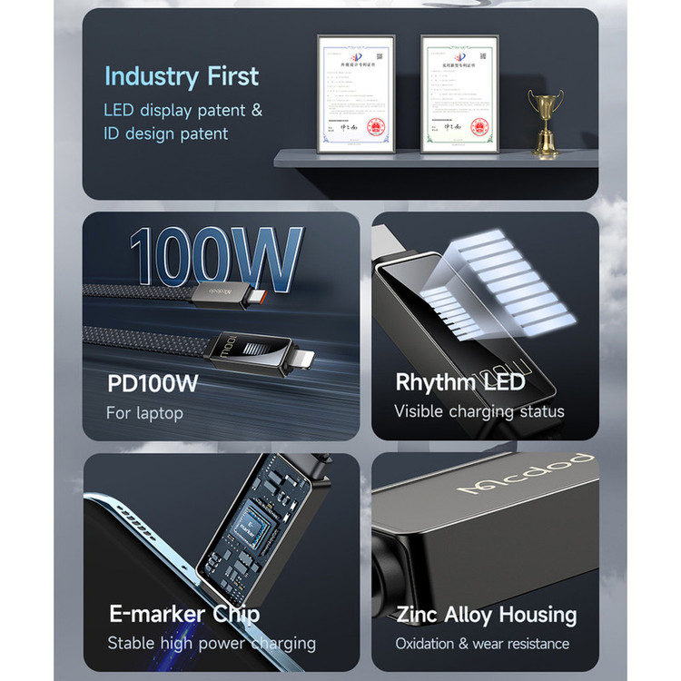 کابل USB-C مک دودو مدل LED RHYTHM طول 1.2 متر دارای LED نشانگر نحوه شارژ ( 9 خط چراغ روشن و خاموش بحالت تنفس شارژ سریع و 5 خط چراغ روشن و خاموش بحالت تنفس شارژ معمولی و 9 خط چراغ روشن ثابت فول شارژ) میباشد.این کابل تخت و کنف ،مقاوم و شکیل است.کابل مک دودو تا 100 وات توان و 5 آمپر جریان پشتیبانی میکند که قابلیت شارژ سریع پروتکل های Huawei SCP, Samsung AFC, OPPO VOOC, QC2.0/ 3.0/ 4.0 را به کاربر میدهد.این کابل قابلیت انتقال اطلاعات تا 480 مگابیت بر ثانیه را دارد.(شارژ سریع بستگی به قابلیت موبایل و تبلت و شارژر مورد استفاده دارد).