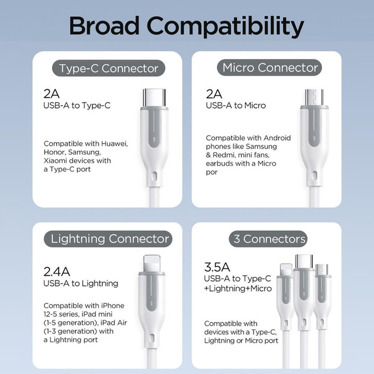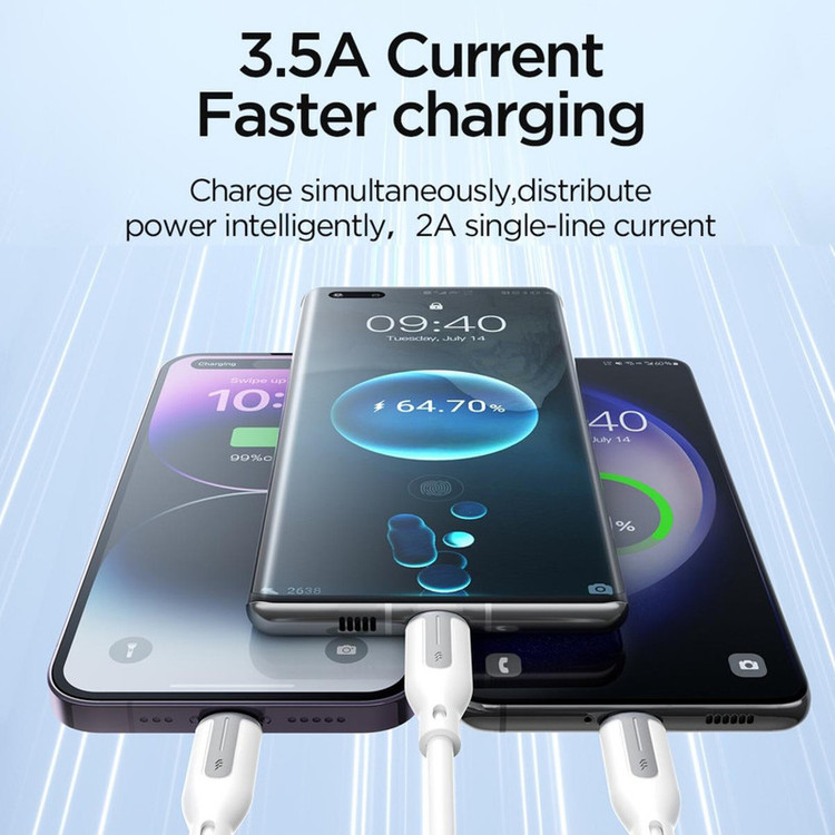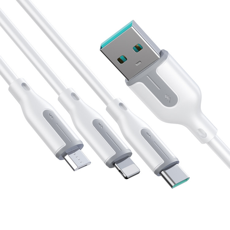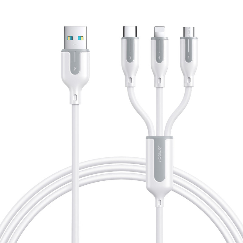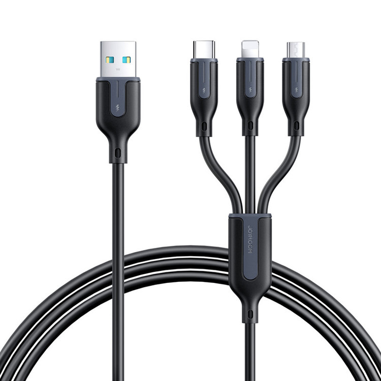 کابل سه سر جوی روم JOYROOM S-1T3018A15 1.2M 3.5A USB-A to Lightning+Type-C+Micro Charging Data Cable : امروزه گوشی های موبایل، تبلت ها و لپ تاپ ها دارای یکی از سه پورت شارژ لایتنینگ ، میکرو یو اس بی و تایپ سی هستند که شما برای شارژ هر کدام از این دستگاه ها که دارای پورت مخصوص به خود می باشد، باید کابل مخصوص آن را نیز با خود داشته باشید. کمپانی JOYROOM با ساخت این کابل سه سر باعث شده تا شما بتوانید با به همراه داشتن یک کابل امکان شارژ هر سه نوع درگاه را داشته باشید. این کابل دارای کانکتور هایLightning ،Type-C وMicro USB بوده و یک شارژ همه کاره است. طراحی: این کابل دارای 3 سری تایپ سی، لایتنینگ و میکرو یو اس پی (Type-C, Lightning, Micro USB) در انتهای کابل و یک سری USB A در ابتدای کابل می باشد. رابط لایتنینگ برای محصولات آیفون استفاده شده، و رابط تایپ سی برای محصولات اندرویدی بیشتر استفاده می شود. طول این کابل 120 سانتی متر بوده که نسبت به کابل های معمولی آزادی عمل بیشتری به کاربر می دهد و شما می توانید به صورت آزادانه به صورت تکی و یا همزمان سه گوشی موبایل را با آن شارژ کنید. با توجه به اینکه جریانی با توان 3.5 آمپر میتواند انتقال دهد، جنس آن بسیار مهم خواهد بود. سری های این محصول به صورت فلزی طراحی شده اند و در برابر ضربه و فشار مقاوم هستند و گفتنی است که جنس این کابل از پی وی سی می باشد که انعطاف پذیر خوبی دارد و مقاوم در برابر شکستگی می باشد این کابل قابلیت تنظیم هوشمند ولتاژ/جریان را دارد و شارژ ایمن بدون گرمای بیش از حد را انجام میدهد.